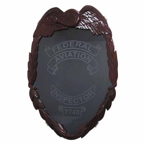 We offer the finest high end furniture quality military retirement shadow boxes and award display cases in the world. This one of a kind custom made mahogany Federal Aviation Administration Inspectors Badge shaped shadow box is the dream choice of any retiring FAA inspector. Our designs come with real glass (not plastic) and are unmatched by other companies. The internal velvet lining comes in red, green, blue, black or maroon.