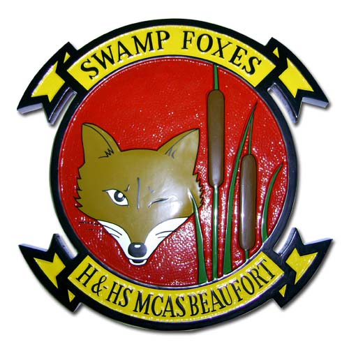 Made from solid mahogany this custom made United States Marine Corps Air Station (MCAS) Beaufort Swamp Foxes emblem wall plaque is hand carved and finished by our expert craftsmen. It is made of solid mahogany and is cured and treated at our own factory to avoid warping and twisting over the years and a special keyhole slot is recessed into the rear to ensure a flush fitting on ay wall surface. Our plaques, seals, emblems and podium logos are made of the highest quality solid mahogany and are perfect for office wall hangings, podiums, business promotional marketing items and unique company gifts.