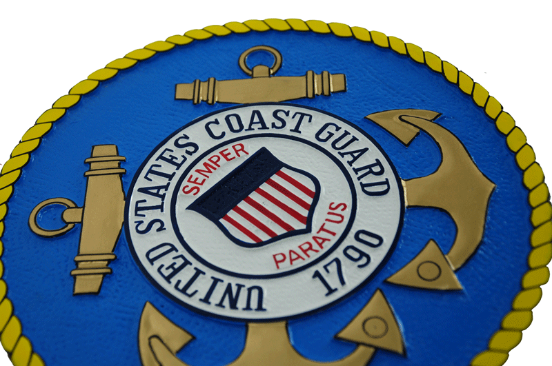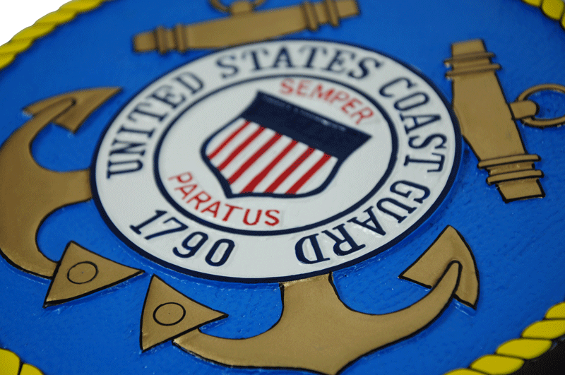 We can manufacture any size or design – Call 1-888-334-6883 for more information. To have a special or unique plaque manufactured makes a wonderful gift, addition to your memorabilia collection or a special retirement present. This US Coast Guard Seal is hand carved and painted from solid mahogany which has been treated and kiln dried to avoid warping and twisting. It is available in seven different sizes as standard but we can make any changes or modifications that you need. Please note that we do not use any stick on letters or inserts, these Military Plaques are manufactured by hand by our trained craftsmen. Our staff have been specially trained to help you with any questions or design issues that you might have. Call us toll free on 1-888-334-6883. If you want to have this beautiful plaque as a table decoration we can supply specially manufactured stands. For more information please call 1-888-334-6883. |