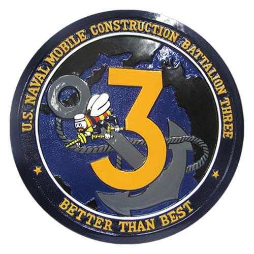 Made from solid mahogany this U.S. Navy Mobile Construction Battalion 3 seal wooden plaque is hand carved and finished by our expert craftsmen. The mahogany is cured and treated at our own factory to avoid warping and twisting over the years and a special keyhole slot is recessed into the rear to ensure a flush fitting on ay wall surface.